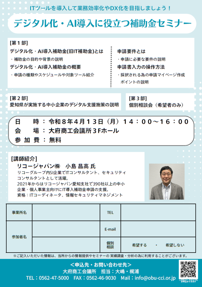 令和8年度よりIT補助金はデジタル化・AI導入補助金に変わりました。事業所のデジタル化とAI導入を目指すために活用できる補助金となっております。また、愛知県が実施するデジタル化支援の施策も併せてご説明いたします。