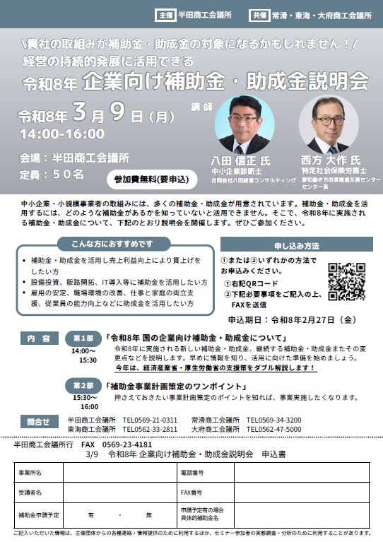 「令和8年企業向け補助金・助成金説明会」を半田商工会議所にて開催します。