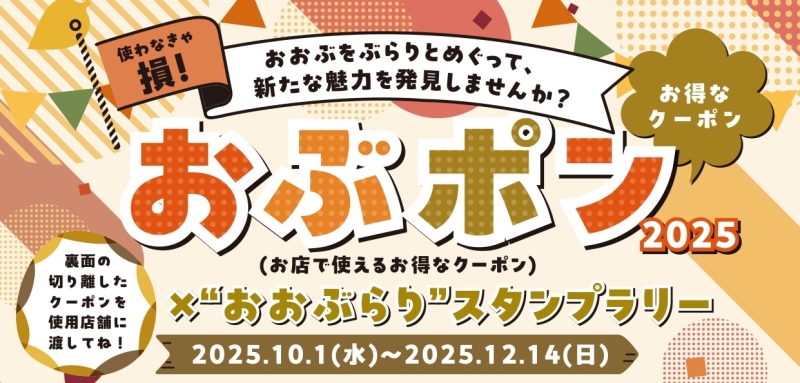 2025年10月1日(水)~12月14日(日)にてお得にめぐるクーポン企画「おぶポン2025」とスタンプラリーを開催します。
