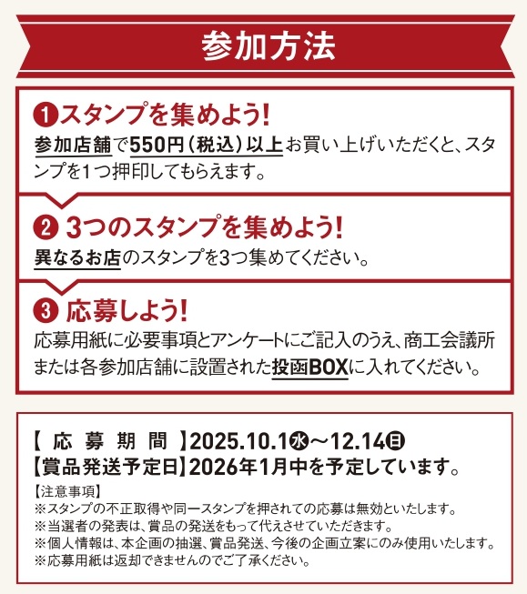 1会計550円(税込)以上のお買上げで1スタンプ。異なるお店のスタンプ3つを集めて応募すると