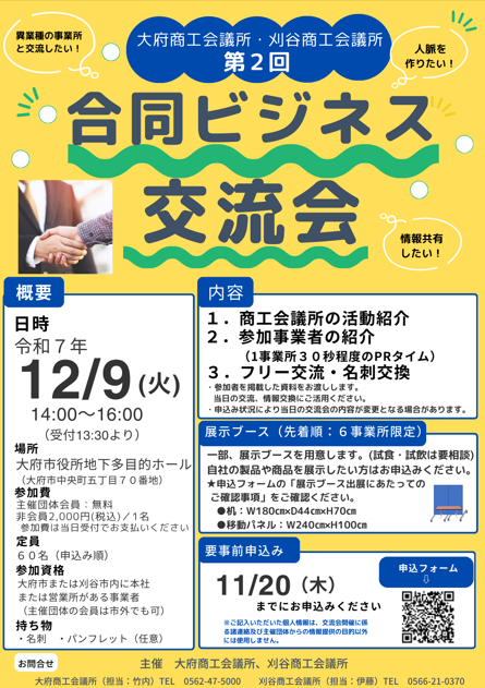大府市役所地下多目的ホールで、刈谷商工会議所と大府商工会議所の合同ビジネス交流会を開催します。