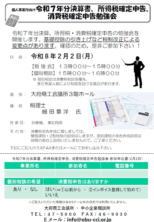 確定申告の勉強会及び個別相談会を開催します。基礎控除の引き上げなど税制改正による変更点があります。確認のため、是非ご参加下さい。また、今年初めてインボイス登録した方は、是非、知識の確認のため、ご参加下さい。
