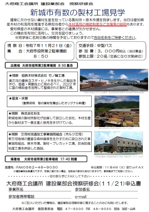 建築に欠かせない資材生産を担っている製材所・原木市場を見学します。当日は愛知県産材の利活用を推進する県担当者から木材活用の補助制度など支援策の説明もあります。愛知県産の木材調達には、事業者との連携が欠かせません。この機会を有効に活用し、交流を図りましょう。