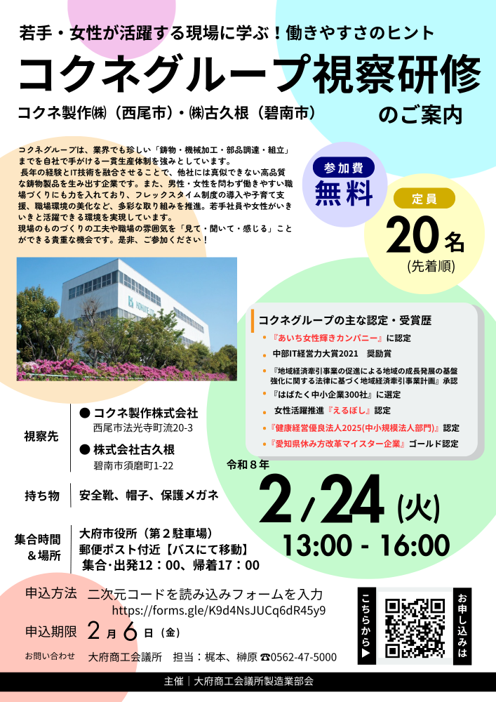 今回は、『コクネグループ』のコクネ製作㈱(西尾市)、㈱古久根(碧南市)の2工場を見学させていただきます。ものづくりの現場の創意工夫、職場の雰囲気など”見て・聞いて・感じる”ことができる貴重な機会となりますので、是非ご参加ください。