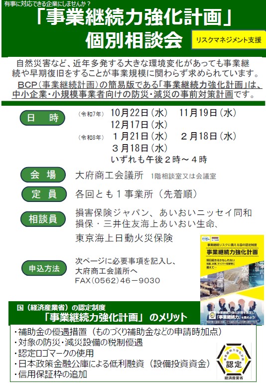 当相談会は、不測の事態に備える為に、事業継続力強化計画の策定を通じ、 貴社に沿った計画書策定を助言し、国の認定申請を支援します。相談を希望される方は以下のチラシをクリックし、2ページ目の枠内に必要事項をご記入いただき、FAX等でお申し込みください。